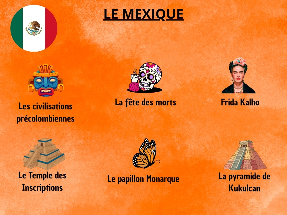 – Le Mexique : les civilisations précolombiennes, la fête des morts, la pyramide de Kukulcán, le Temple des Inscriptions, le cratère de Chicxulub, le papillon Monarque, Frida Kahlo…