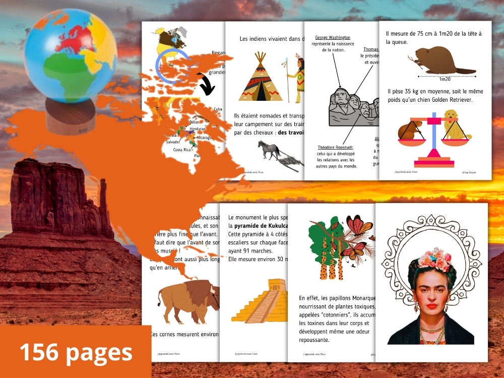 Ce dossier permet à l’enfant de découvrir l’Amérique du Nord dans sa globalité : sa position dans le monde, ses climats, son histoire, ainsi que des pays emblématiques comme le Canada, les États-Unis et le Mexique. Les notions sont abordées de manière progressive, concrète et adaptée à son âge.