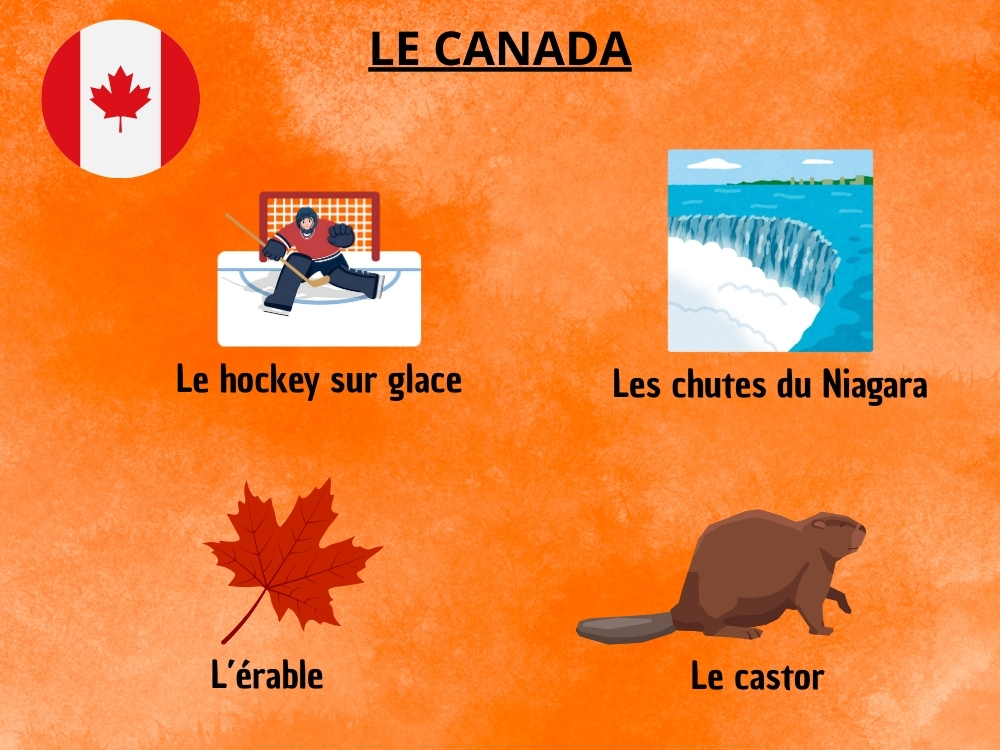 – Le Canada : les chutes du Niagara, l’érable, le hockey sur glace, le castor…